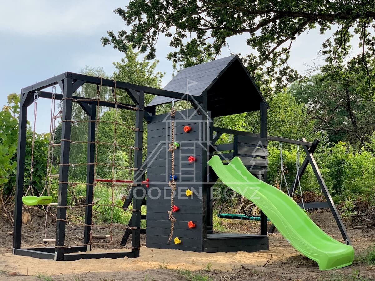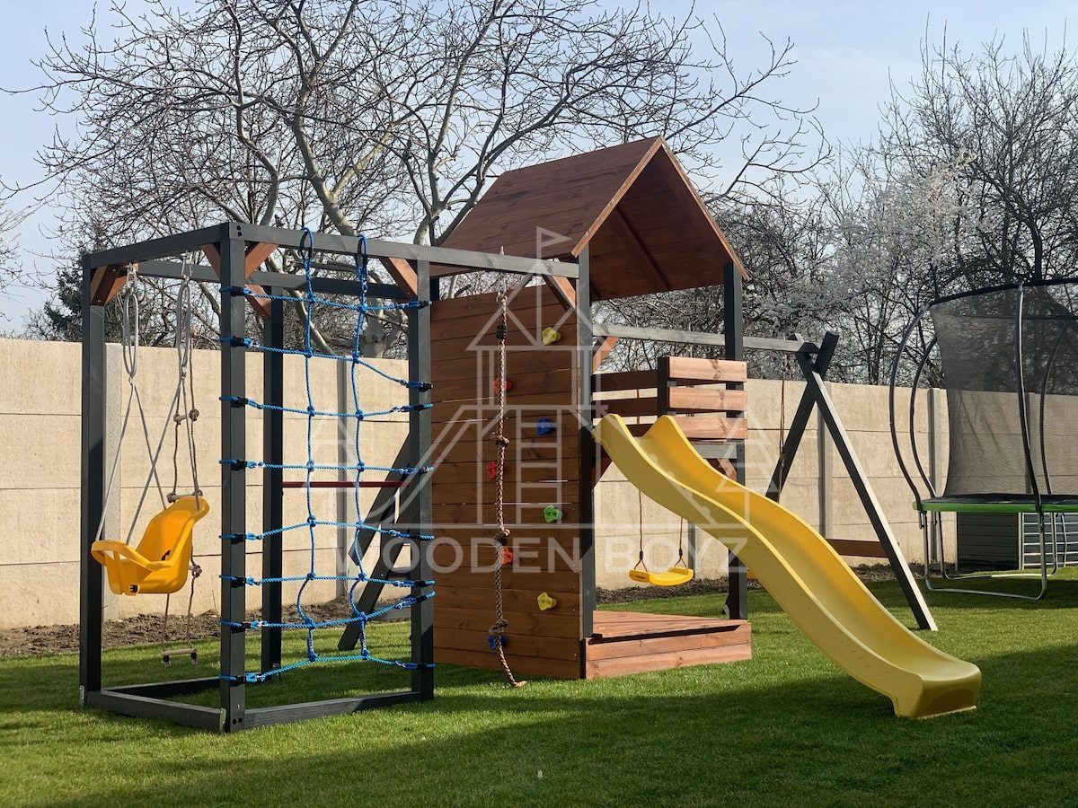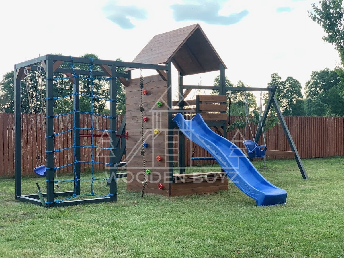 | Standardní vybavení | Otevřené pískoviště Věž s lezeckou stěnou – do výšky podesty Schody Houpačka – na výběr kyblík pro nejmenší nebo plastové prkénko Skluzavka délky 2,5 m s možností připojení vody Lezecká síť Hrazda na akrobacii Lano a žebřík pro různé variace Impregnační nátěry a doplňky – široká paleta barev na výběr |